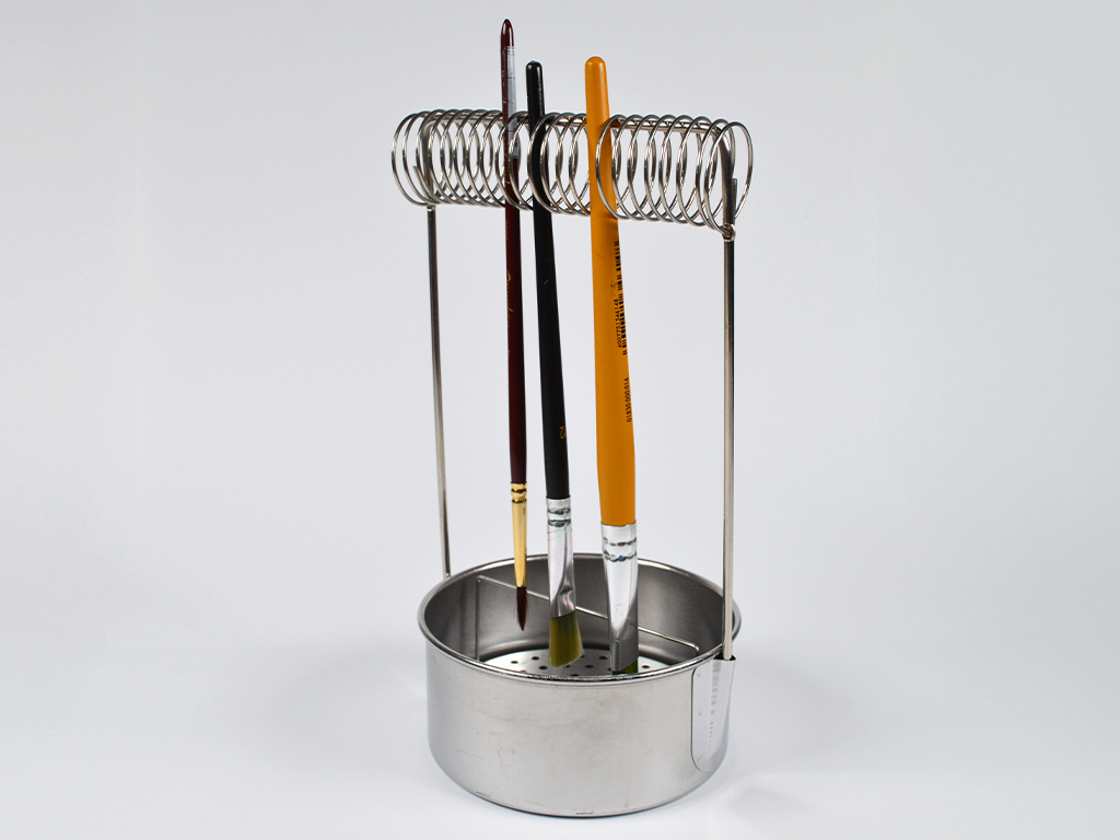 The Sinoart metal brush cleaning stand keeps your brushes upright, protecting the bristles and preventing water from soaking into the handles. Simply wash your brushes in the cup and hang them to dry on the metal spiral. The removable metal grill catches paint particles, keeping the water cleaner for longer and making brush maintenance easier and more efficient.