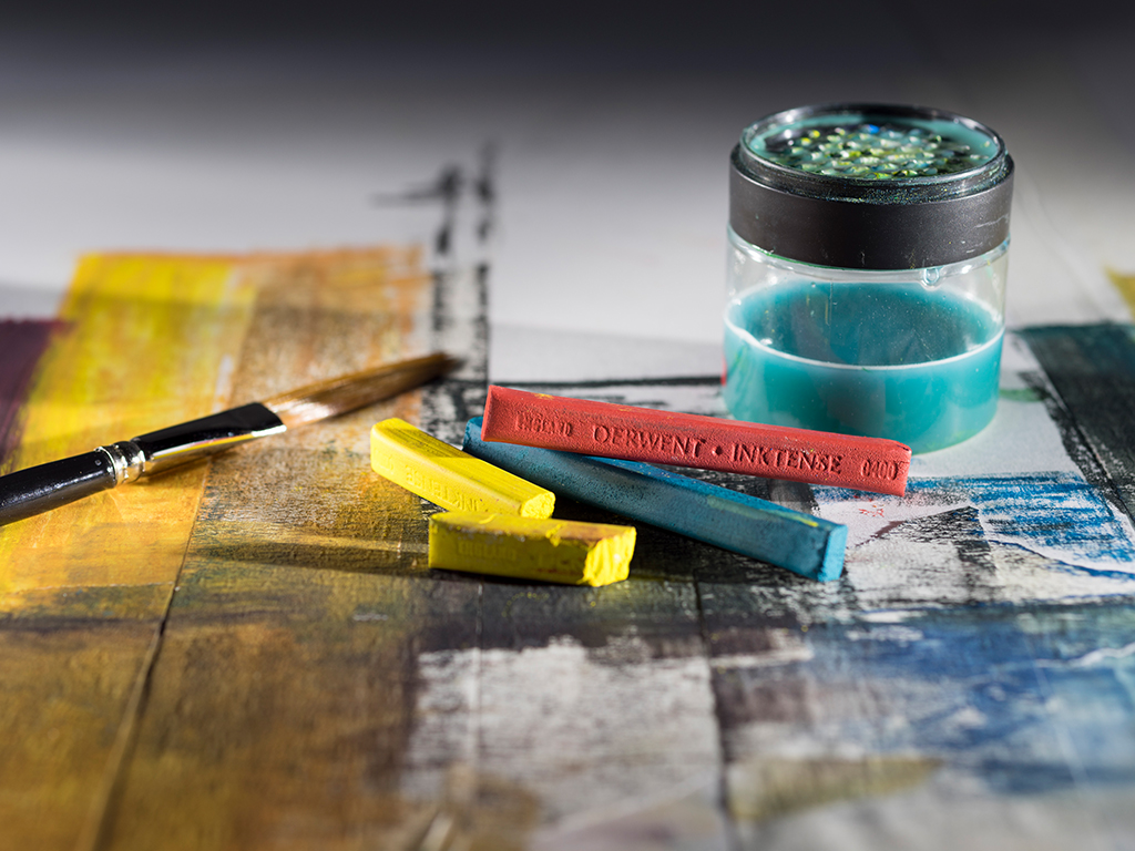 Dry Derwent Inktense delivers pure vibrant colour but when completely washed out it is transformed into a translucent ink-like paint which, when dry, can be worked over.