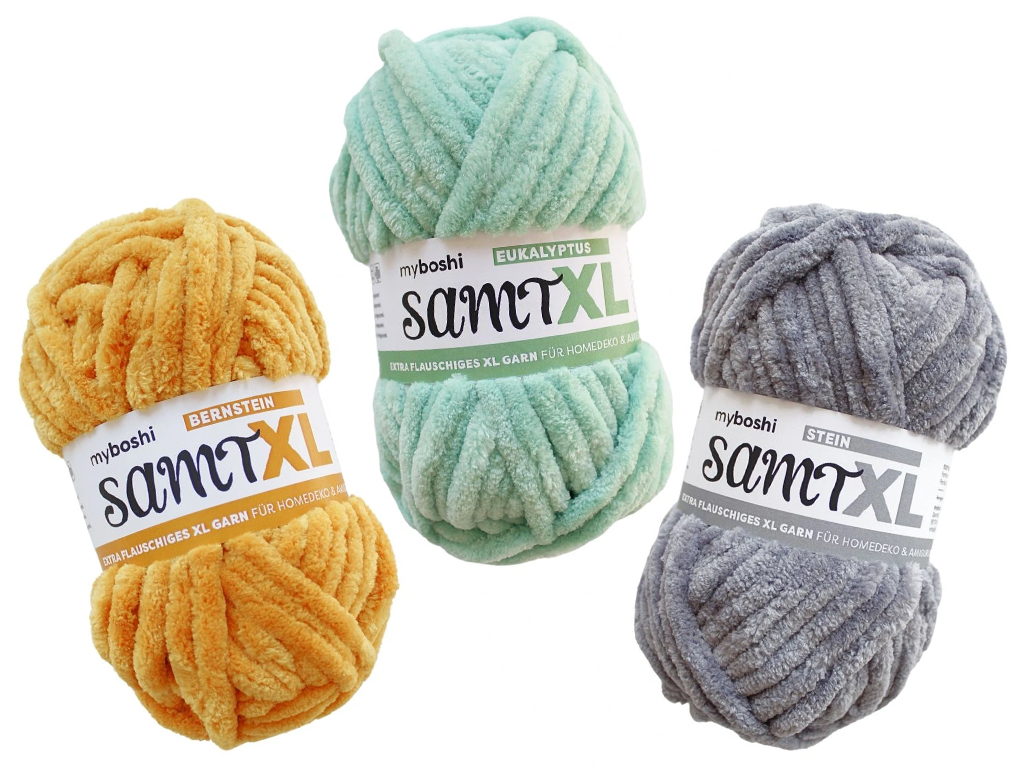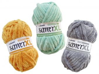 „Myboshi Samt XL“ – tai pagaminti iš 100 procentų poliesterio ypač stori ir švelnūs, minkšti tarsi aksomas siūlai. Prabangiai puri tekstūra puikiai tinka itin jaukiems ir maloniai šiltiems daiktams. Siūlai yra minkšti, švelnūs, nedirgina odos, stori, todėl mezgami labai greitai, o tai ypač malonu didesniems, šaltam orui tinkantiems projektams.