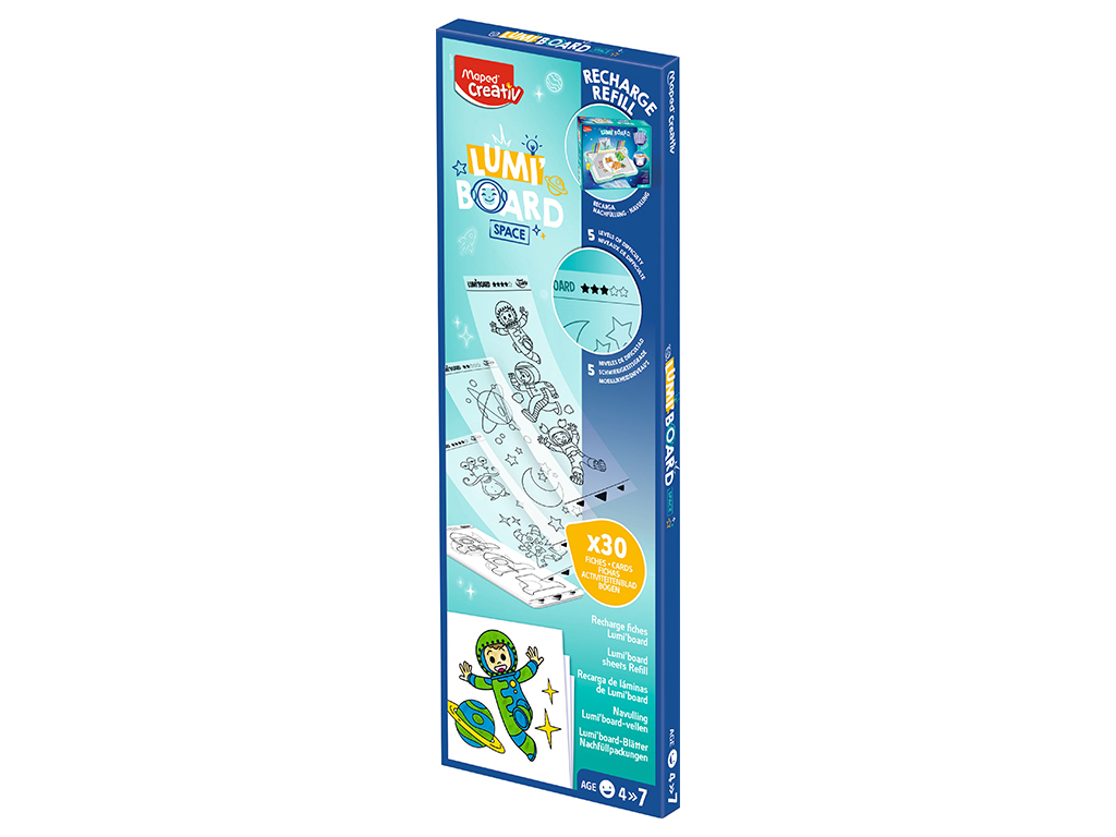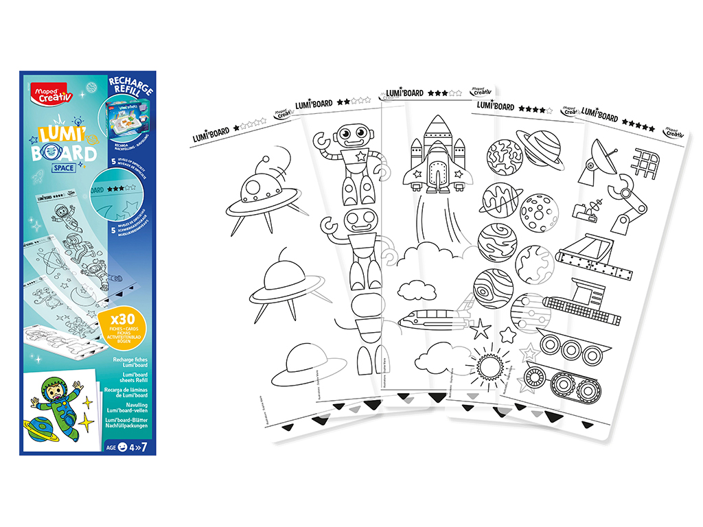 Šabloonlehed valguskastile Maped Creativ Lumi Board. Lisa mitmekesisust ja pikenda lõbu—lihtsalt sisesta uus šabloonleht, aseta uus joonistuspaber valguskastile ja alusta joonistamist. Täiuslik viis loovuse sütitamiseks! Sobib kõikide Maped Creativ Lumi Board versioonidega. Komplekt sisaldab 30 unikaalset šabloonlehte lõbusate piltidega.